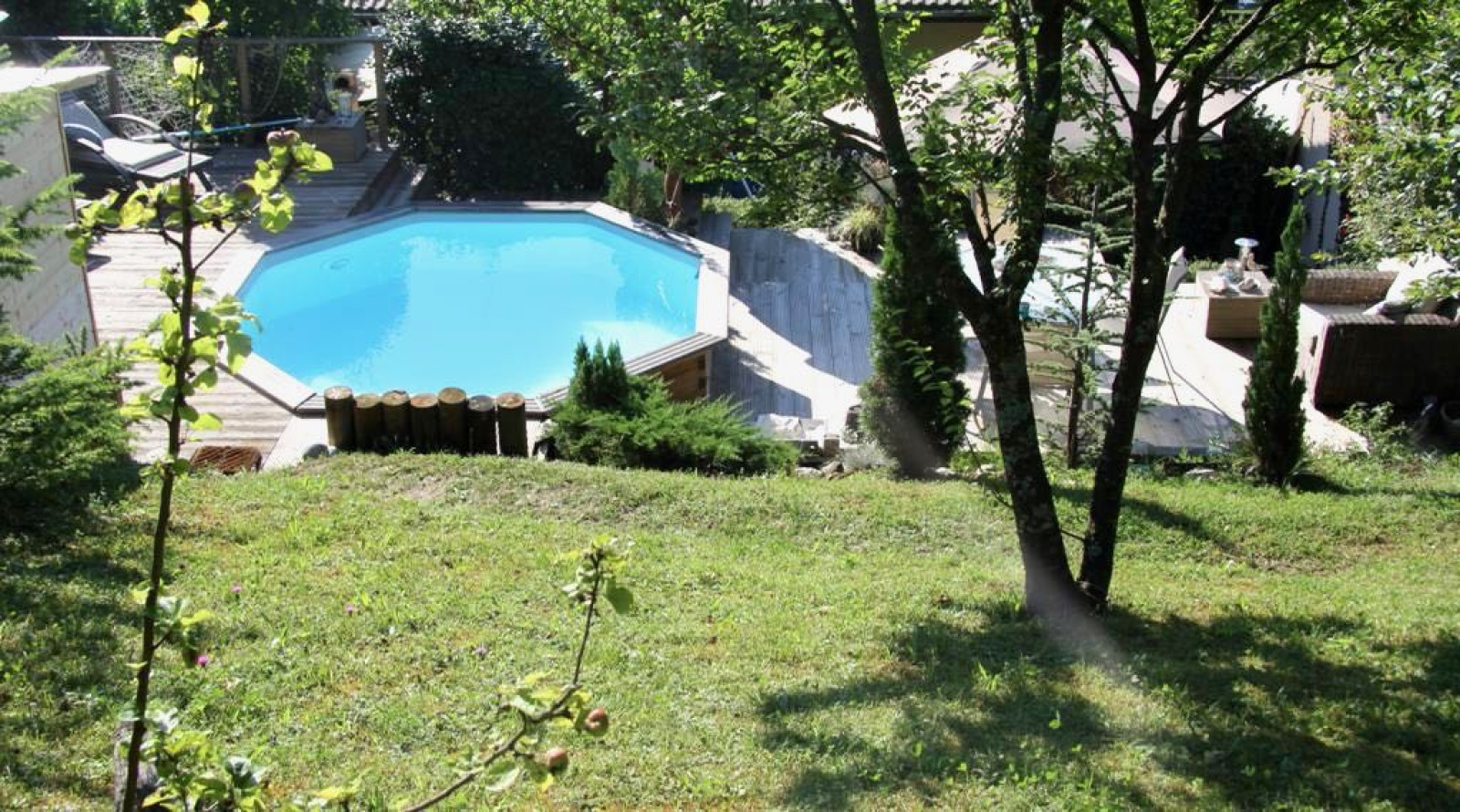 Son jardin clôt et arboré au calme sans le moindre vis à vis et sa vue sur les montagnes.
