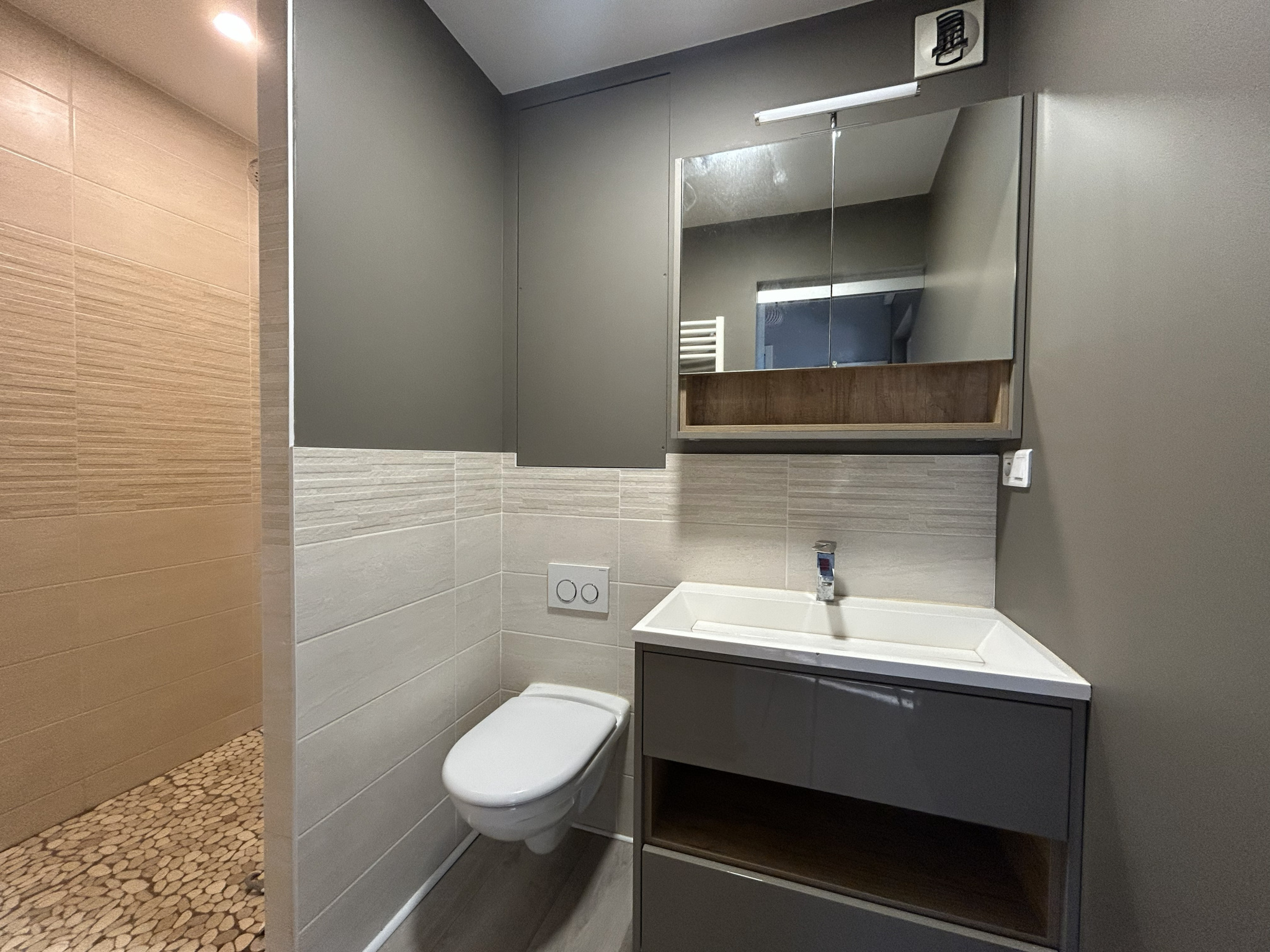 La salle de bains avec WC dispose d’une douche à l’italienne, alliant confort et modernité.